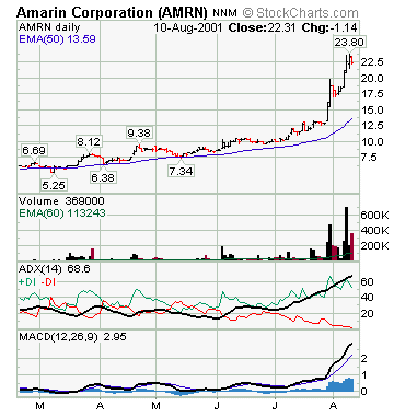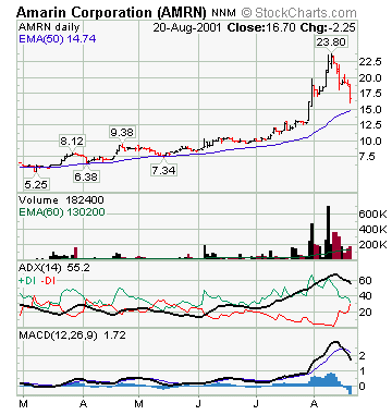 AMRN was a stock that had an ADX Value of 69 on Aug10,2001 with a price that was